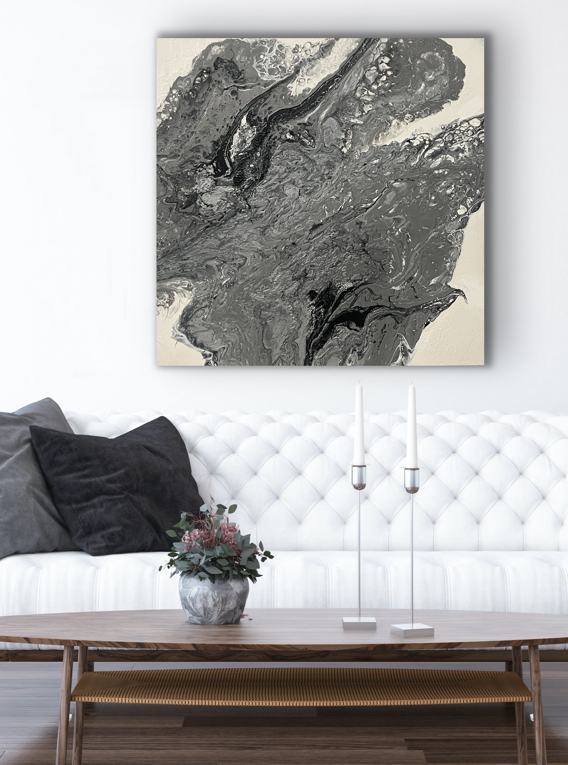 This combination of Black, White and Greys flows together perfectly, creating the Most Beautiful abstract One Of A Kind, painting that would look Beautiful hanging in any room.
