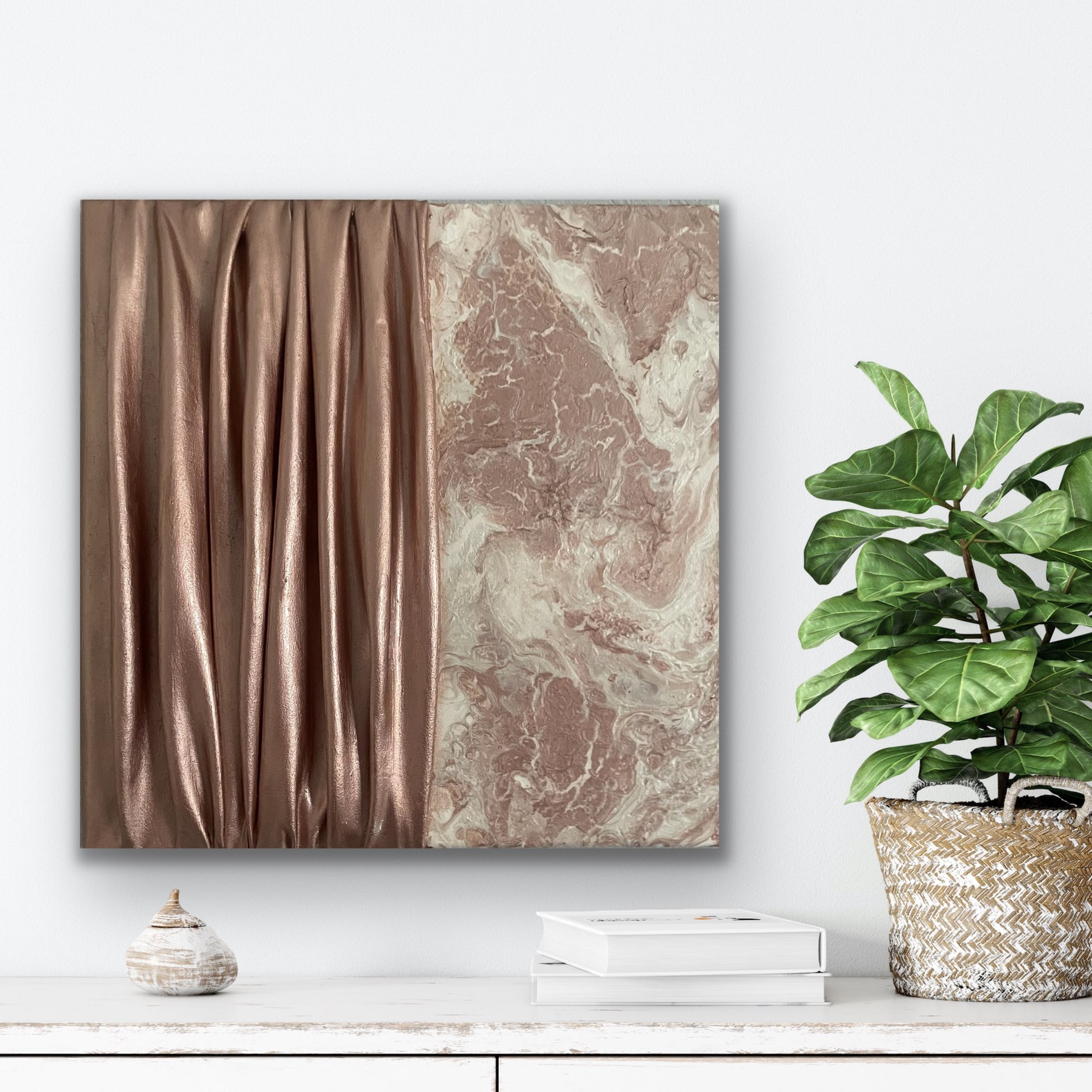 This one-of-a-kind canvas artwork pairs soft texture while maintaining an elegant look. Other side features the fluid movement of draped fabric in solid Rose Gold, adding depth and dimension, while the other is a textured abstract blend of Rose Gold and Cream, bringing everything together for the most beautifully.